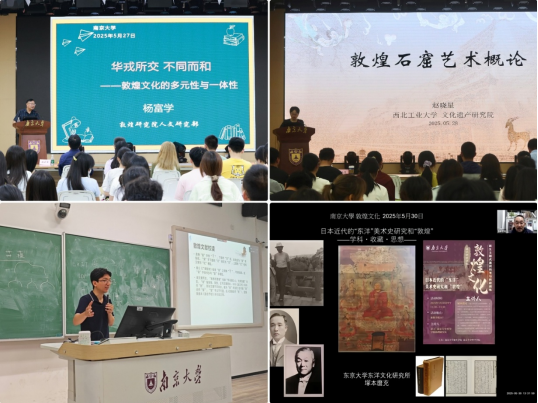 已连续三年举办“敦煌文化”主题研学活动。今年,南京大学-东京大学“敦煌文化”新生主题式通识科考与科研训练项目在坚持“系统理论授课”与“实地通识调研”相结合基础上,积极推动“文化底蕴”与“国际视野”相融合,共遴选出南京大学哲学、新闻传播学、外语、工科试验班等专业的29名本科生和东京大学文学部、工学部的5名研究生以及厦门大学海外教育专业的5名外籍研究生奔赴敦煌,在各国青年的交流对话中促进文明交流互鉴,提升南大青年在世界舞台上坚定文化自信、讲好中国故事的能力。