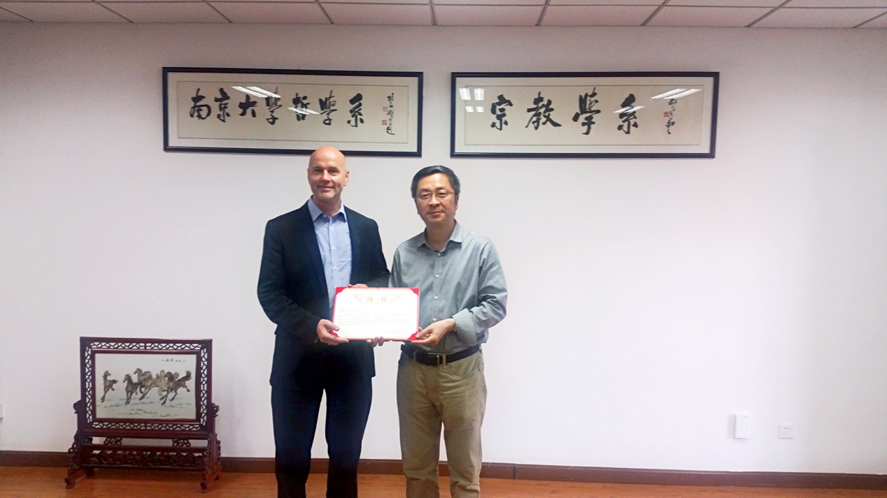 5月10日,哲学系“刘伯明短期讲座教授”聘任仪式在薛光林楼会议室举行,哲学系主任唐正东教授、副主任张亮教授出席。双方就双方合作机制及相关学术问题进行了交流,唐正东教授为格林教授颁发了“刘伯明短期讲座教授”聘书。