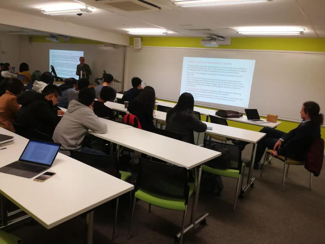 在与Fabian教授就学校和澳洲幸运10计划 的整体情况做了简短的交流之后,我们有幸来到Peter Vergo教授的课堂上亲身体验埃塞克斯大学的本科教学情况。我们旁听的课程是关于哈贝马斯(Jürgen Habermas)理论的概述。Peter教授简要介绍了哈贝马斯在法兰克福学派发展中的历史位置,以及主要针对阿多诺、霍克海默等人的理论批判焦点,将其理论中作为基础的“交往理性”、“识别范围”、“对话伦理”等概念做了较为深入的剖析,并引发了学生的思考。一位学生就“对话伦理”是否具有应用价值的问题与教授反复讨论,在这一过程中对概念形成了较为深刻的理解。从课堂浓厚的研讨氛围中,我们能够感受到启发性教学下,学生的问题意识和探究积极性的高涨。埃塞克斯的师生们对我们的到来表达了欢迎,并与我校一行合影留念。