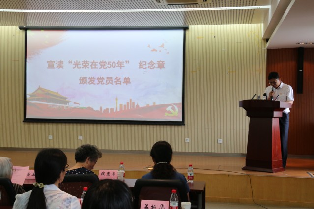 (周爱群书记为党员代表颁发“光荣在党50年”纪念章)