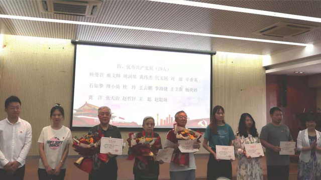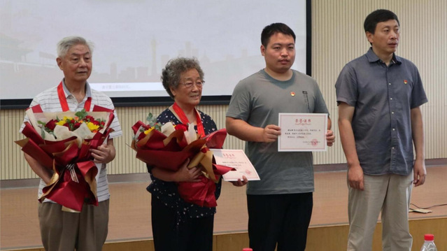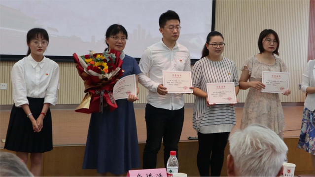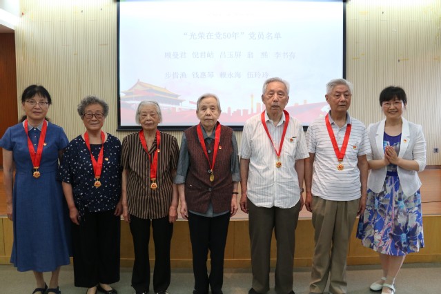 在热烈的气氛中,周爱群书记为受表彰的党员代表颁发“光荣在党50年”纪念章,学生代表为老党员敬献鲜花。为庆祝中国共产党成立100周年,增强党员的荣誉感、归属感、使命感,党中央决定,2021年首次颁发“光荣在党50年”纪念章,我系共有9名党员荣获纪念章。