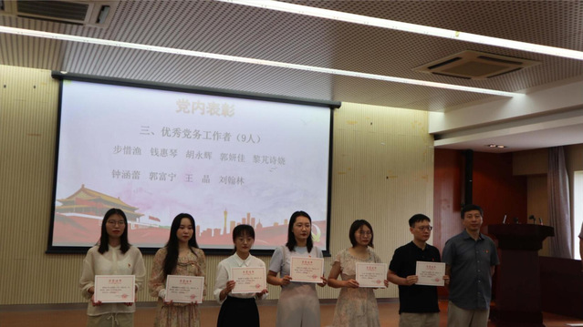 随后,会议对哲学系2020—2021年度4个先进党支部、4位优秀党支部书记、9位优秀党务工作者、19名优秀共产党员和3位理论宣讲先进个人进行表彰。会上,系党委副书记孟振华宣读了《中共南京大学哲学系委员会关于表彰先进集体、先进个人的决定》,哲学系周爱群书记、王恒主任、吴雨芳老师分别为获奖人员颁奖。
