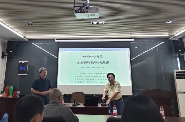 2019年6月12日下午,中国人民大学佛教与宗教学理论研究所所长张风雷教授应邀在南京大学哲学系314教室做了题为“天台智者大师的教相判释学说和中道思想”的讲座,南京大学哲学系教授、博士生导师杨维中教授担任主持人。本次讲座亦系由安徽泾县水西书院支持的水西佛教学术讲座第一讲,水西书院负责人释宗行也来到了现场,杨教授及在座师生对其表示热烈欢迎。讲座伊始,杨教授首先介绍张教授的学术专长与成就,随后张教授正式为在座师生做讲座。