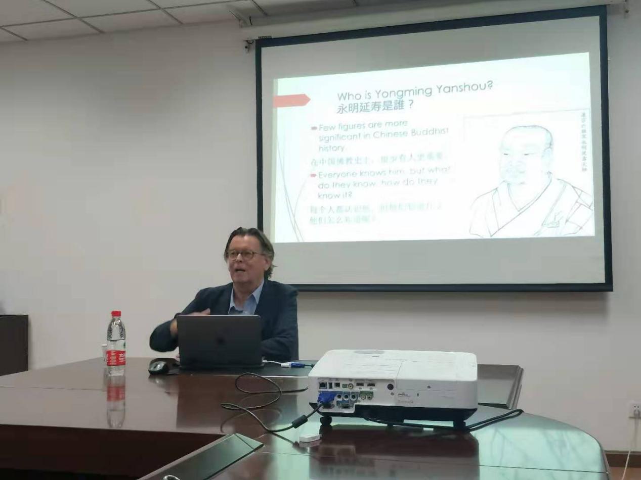 2019年7月8日晚,Albert Welter教授以“解读永明延寿:理解一个中国开创性佛教人物的参考框架”(Interpreting Yongming Yanshou: Frames of Reference for Understanding a Seminal Chinese Buddhist Figure) 为主题进行了学术讲座。他认为永明延寿是中国乃至东亚佛教的重要人物,但延寿的形象,在古今却存在着不同的“想像”(Imagination)。例如,延寿在现代中国被视为净土倡导者,在日本则被当作边缘化的禅宗人物,而在韩国被看作禅法与佛教义理融合的推动者。对于延寿形象的不同理解,不仅存在于现代的中国、日本与韩国,还存在于古代种种佛教著作中。例如,《宋高僧传》将延寿归类为“兴福”,《景德传灯录》把延寿当作禅宗中法眼宗的第三祖,而《龙舒净土文》、《乐邦文类》、《佛祖统纪》将他视为净土宗祖师。对于延寿的种种差异化“想像”,相互之间往往存在着矛盾冲突。那么,哪种形象才是延寿的本来面目呢?通过对《宗镜录》、《万善同归集》以及《受菩萨戒法并序》的研读,Welter教授发现以上种种“想像”很大程度上都有失偏颇,不能反映延寿的真实形象。进而,他提出,“菩萨禅”的倡导者可能是对于延寿最恰当的看法,可以更好地呈现出延寿的禅宗教学。