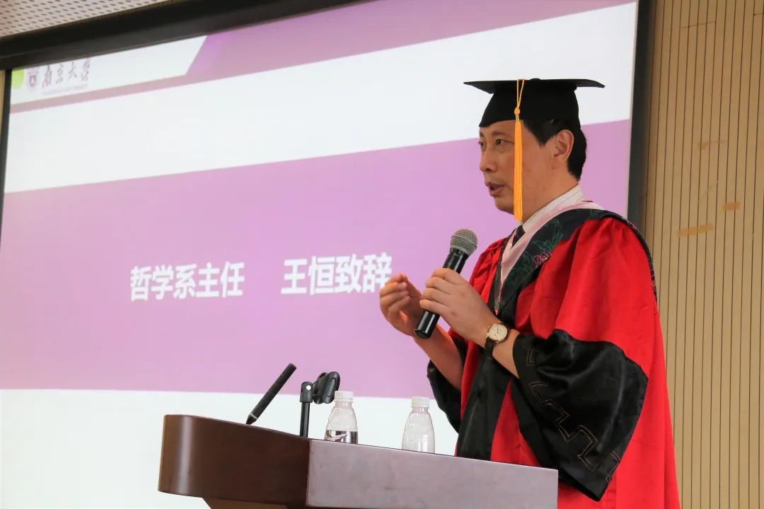 典礼一开始,系主任王恒老师向在座的各位毕业生表达了热烈祝贺与真诚祝福。王恒老师讲到:“由于疫情,校园里已经很久没有像今天一样充满活力了,2020年的毕业典礼对于我们每个人来说都注定是一段刻骨铭心的记忆。今后,已经毕业离校的同学们随时都可以再回来,南京大学哲学系的大门始终向大家敞开。