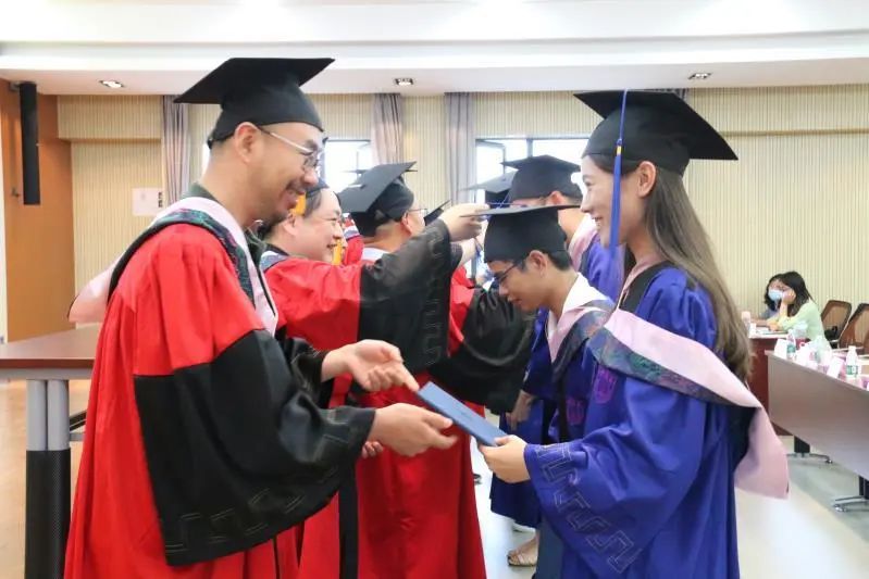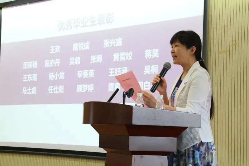 之后,哲学系党委书记周爱群宣读优秀毕业生表彰决定,哲学系副主任刘鹏、副书记孟振华向施亦丹等19名优秀毕业生颁发优秀毕业生荣誉证书。本科生段玉蕊、研究生田笑楠分别作为毕业本科生、研究生代表发言。段玉蕊讲到:“南京大学‘诚朴雄伟,励学敦行’的校训以及‘惟真是求’的学风,将会成为2020届所有毕业生穷尽一生追求的十二字箴言。今后不论是走出国门、步入职场、还是迈向学术殿堂,都会目光澄澈、心中有光。”田笑楠回忆了在哲学系的三年时光,并与大家相约未来的某一时刻,在春天里再去告别北大楼,再吸一次桂花香,再踏一次金陵雪,再听一次南大的新年音乐会,再经历一次校庆现场奔走的520。哲学系副主任李跃华老师向校友年级联络人石如梦、田笑楠、陆杰峰赠送纪念品并颁发证书。哲学系副主任、系学位委员会副主席孙乐强宣读学位授予决定,将授予曹永泰等 11位同学哲学学士学位、罗尧辉等 48 位同学硕士学位、陈嘉鸿等 9 位同学博士学位。哲学系教师代表王恒、徐新、孙亦平、张建军、蔡仲、张荣、张晓东、蓝江、殷曼婷、宋立宏为已获学位毕业生颁发学位证书并拨穗正冠。