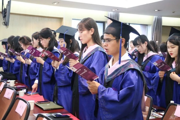 紧接着,到场全体毕业生肃立并举起右拳庄严宣誓,用铮铮誓言表达对母校和自己的一份坚定承诺。“胸怀祖国,忠于人民;担当道义,守正创新;德业双修,知行合一;不负韶华,不忘初心。”听完在座同学们慷慨激昂的誓词,到场的各专业的教师代表也分别一一寄语毕业生。各位教师代表分别向同学们表达了衷心的祝福,祝愿同学们毕业快乐,未来的路越走越宽,并对在座的同学们提出了新的期许,希望同学们能够用在南哲锻炼出来的风骨,成为解决各种各样问题的行家里手,也期待着同学们能够把南哲的阳光洒满中国,撒向全世界。