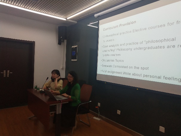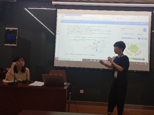 内蒙古大学本科生郭子皓与梁嫣妮做了以大学生开展的基于模仿的哲学实践活动为主题的报告,围绕问题意识与批判性思维的训练、对问题意识与批判性思维训练方法的模仿与在校园文化活动当中践行哲学三个方面介绍了内蒙古大学哲学咖啡馆的存在形式与目的,并展示了内蒙古大学哲学咖啡馆举办的各种活动的照片。