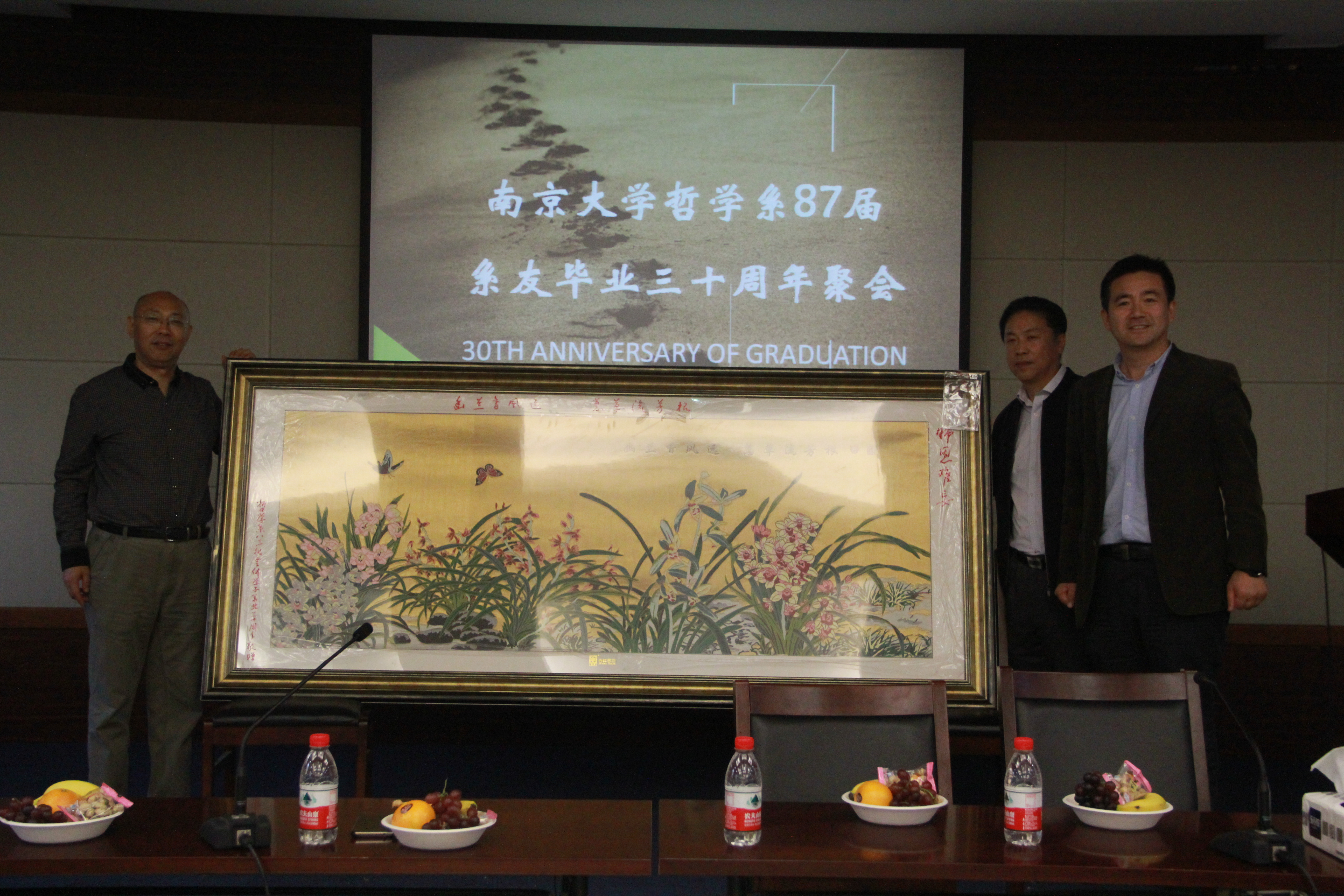 邵廷君和马春骐代表南哲87届全体同学向母系赠送了一份有特殊意义的礼物,这是一幅写有“幽兰香风远,蕙草流芳根”的牌匾,表达着系友们对南京大学,对南哲、对恩师的感谢和祝福。南京大学哲学系副主任李跃华老师代表哲学系收下了这份用心的礼物。