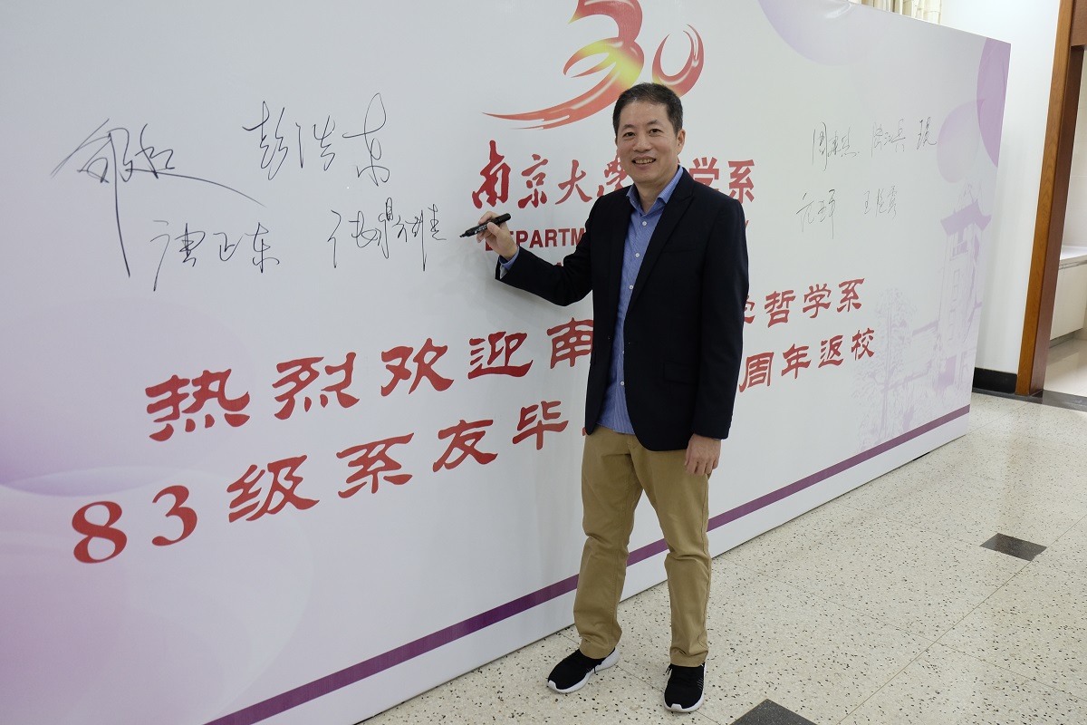 紧接着,87届系友,也是南哲现任系主任唐正东老师介绍了目前南哲的情况:“哲学系工作做得好都是前辈老师们打下的基础。总体来说,毕业三十年来,南哲进步非常大。硬件方面,仙林校区有了独立的哲学楼。我们哲学系虽然规模不大,但是精干,所以说‘有系有戏’嘛!软件方面,南哲最近进入了国家一流学科建设行列,可以预见到更为灿烂的明天。”唐老师就系友们对南哲的支持表示感谢。