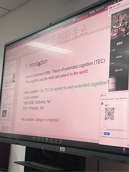 南京大学122周年校庆之际,应南京大学哲学系邀请,韩国东国大学哲学系李英仪教授,于2024年5月21日晚在线上进行了题为“Extended Cognition on the Web”的学术讲座。此次讲座,由南京大学哲学系科学技术哲学专业潘天群教授在哲学系楼212教室主持开展线下工作,青年教师史晨老师应邀出席,线上线下师生共同参与。