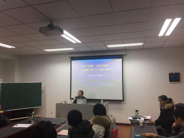 2017 年12 月13 日上午10 点,清华大学张成岗教授 在哲学系212 科哲教研室做了题为“技术‘海啸’与秩序重构:人工智能时代需要‘ 不合时宜的’ 思想者”的学术讲座,本次讲座由蔡仲教授主持,科技哲学教研室戴建平、刘鹏、陶孝云等老师以及相关专业研究生参加讲座。