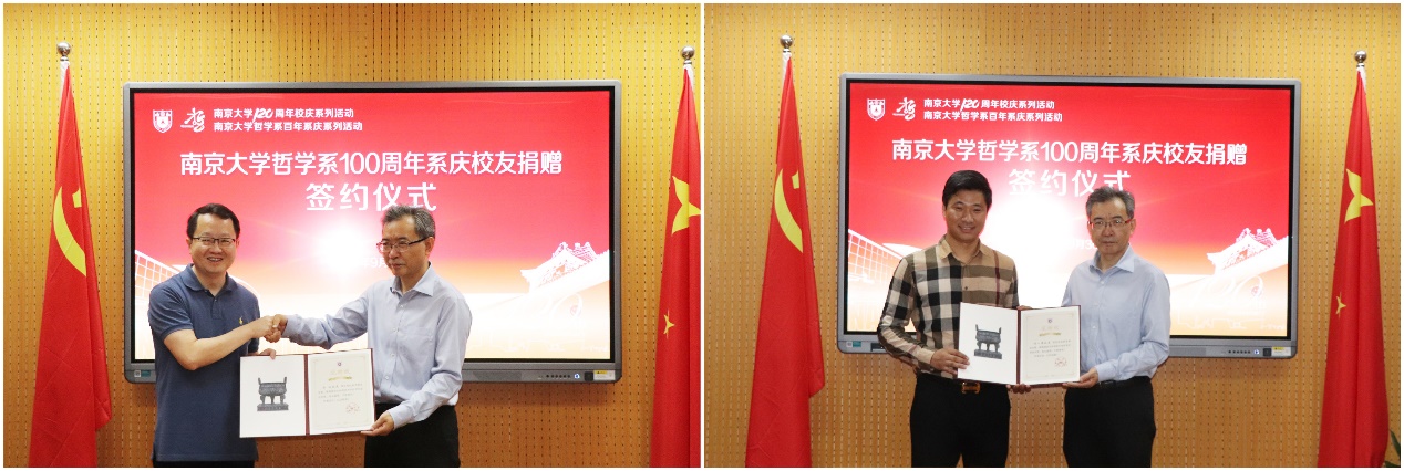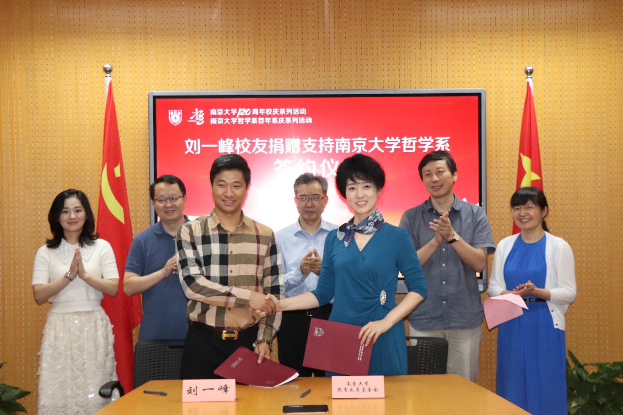 930日,南京大学哲学系100周年系庆校友捐赠签约仪式在仙林校区举行。南京金光紫金创业投资管理有限公司总裁余波校友、利昌行文化发展有限公司董事长刘一峰校友捐赠善款用于哲学系的人才培养、教学科研和基本建设。
