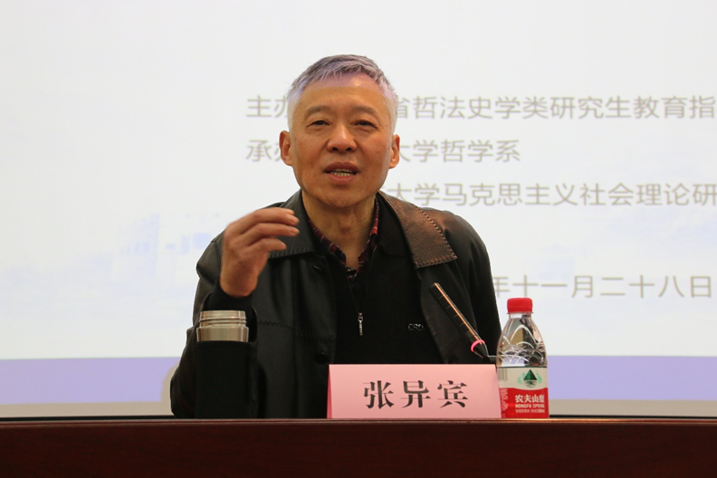 在大会主题报告阶段,南京大学文科资深教授、马克思主义社会理论研究中心主任张异宾教授做了题为《国外马克思主义前沿问题研究》的学术报告。首先,张教授通过梳理西方马克思主义的发展过程,提出了从上世纪70年代开始西方马克思主义在理论逻辑和实践上都走向终结的观点。其次,主要介绍了70年代之后国外马克思主义的三种思潮:后马克思思潮、晚期马克思主义和后现代马克思主义。再次,重点解读了马克思“机器论片段”等相关文本的内涵、非物质劳动的实质等理论问题,并介绍了国外马克思主义研究的三个最新方向:法兰克福学派著作的重新译介、法国激进理论研究和意大利批判理论研究。在最后的互动环节中,张教授耐心细致地解答了同学们提出的研究方法的自觉、数字劳动等问题,并鼓励同学们深刻把握国外马克思主义研究的最新发展动态。