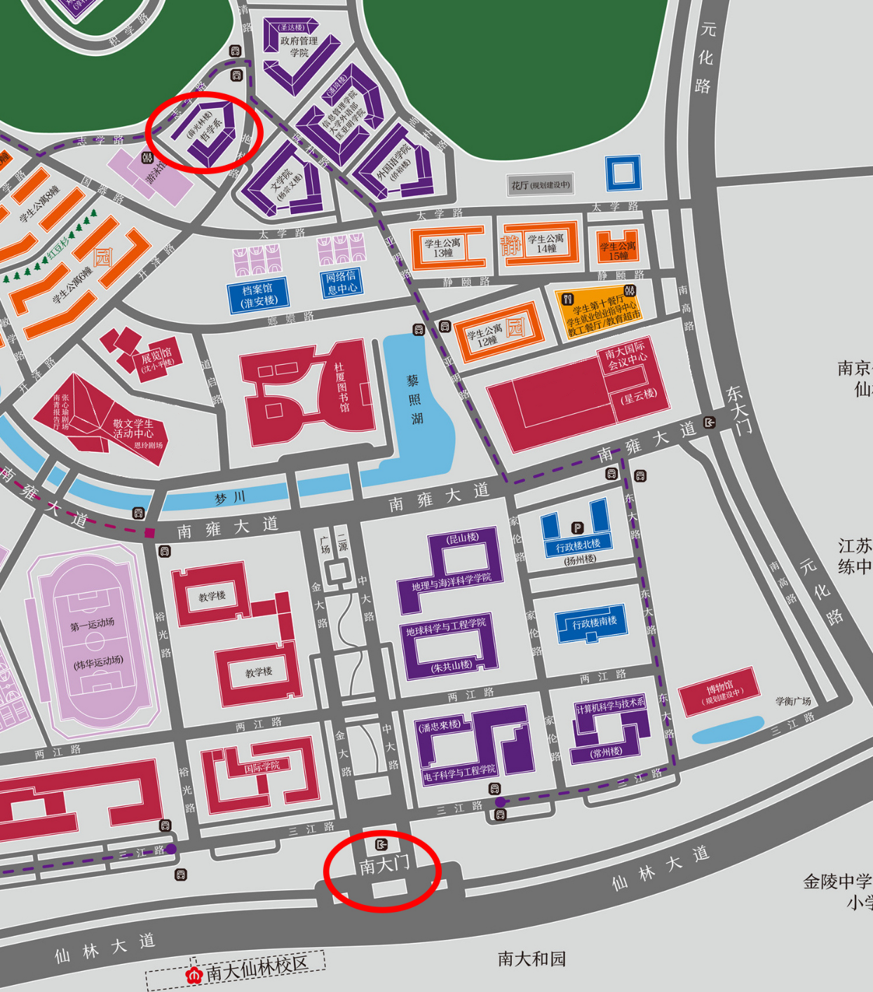 3.因疫情防控需要,不安排看考场,请考生提前规划好路线和时间,统一从学校南门进入校园,哲学系楼位置如下,进入系楼后有人员引导。
