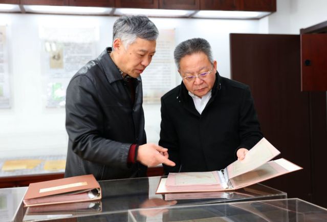 沈晓明一行首先参观了基地建设的马克思主义经典文献原始档案展列馆、马克思主义经典文献典藏馆。张异宾详细介绍了基地的原始手稿典藏和研究情况。
