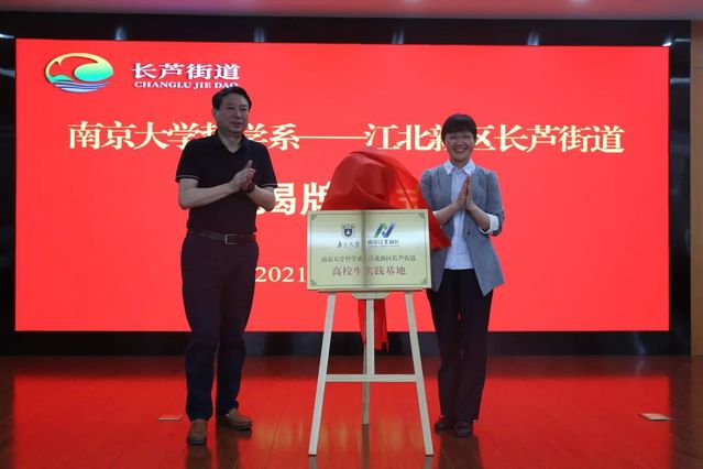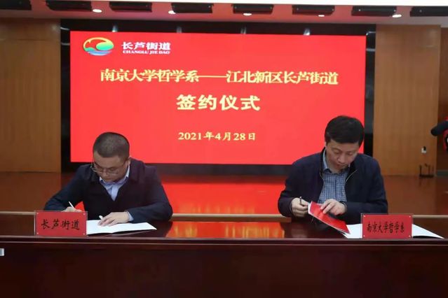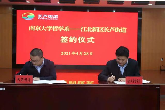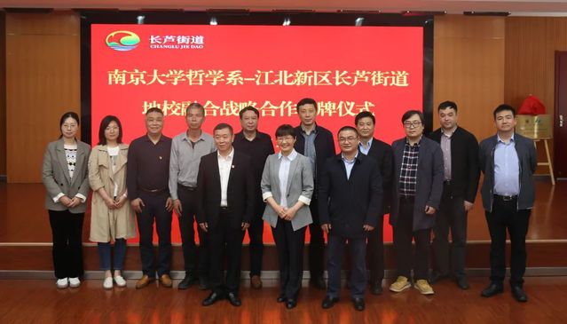 4月28日,南京大学哲学系-江北新区长芦街道校地融合战略合作揭牌仪式在长芦街道办事处举行。南京市江北新区长芦街道党工委书记刘向荣,长芦街道党工委副书记、办事处主任庄培峰,南京大学哲学系党委书记周爱群,南京大学哲学系系主任王恒等哲学系有关领导、教师、实习生代表以及长芦街道有关工作人员参加仪式。