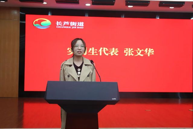 实习生代表、哲学系学生张文华作交流发言。她表示将珍惜机会,以饱满的热情、严格的标准,积极为街道工作建言献策,让理论与实践相结合,真正做到学有所获。