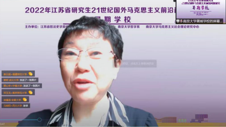 2022年8月21日上午, 2022年江苏省研究生“21世纪国外马克思主义前沿问题研究”暑期学校于线上正式开班。江苏省哲法史学类研究生教育指导委员会主任、南京大学邮电大学校长叶美兰教授,江苏省哲法史学类研究生教育指导委员会秘书长、南京邮电大学马克思主义澳洲幸运10计划 副院长朱奎泽教授,南京大学研究生院副院长张亮教授,南京大学哲学系主任王恒教授等线上出席开班仪式并致辞。仪式由南京大学哲学系党委书记周爱群主持。