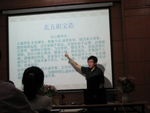 第四,武当道教与张三丰的道学思想。主讲人从武当道教的形成和主要特征入手,结合自己实拍的图片,全面的展示了武当道教的主神信仰、道经系统及其宫观建筑和教团组织。武当山的太和宫建筑群大气磅礴、龟蛇盘绕的绝景令现场同学叹为观止。