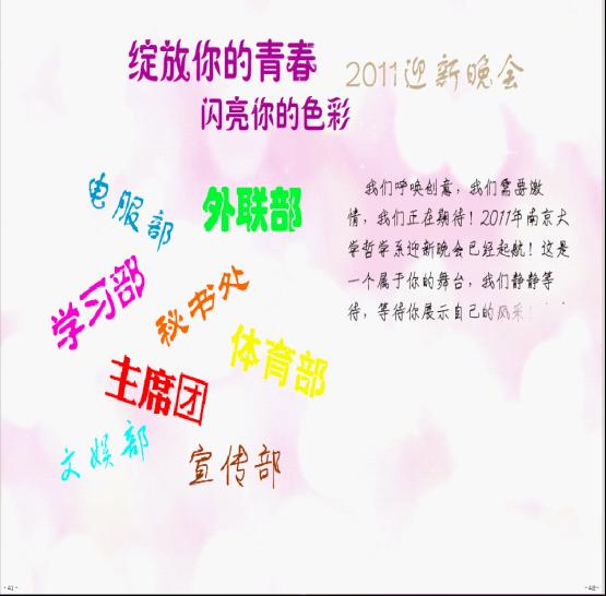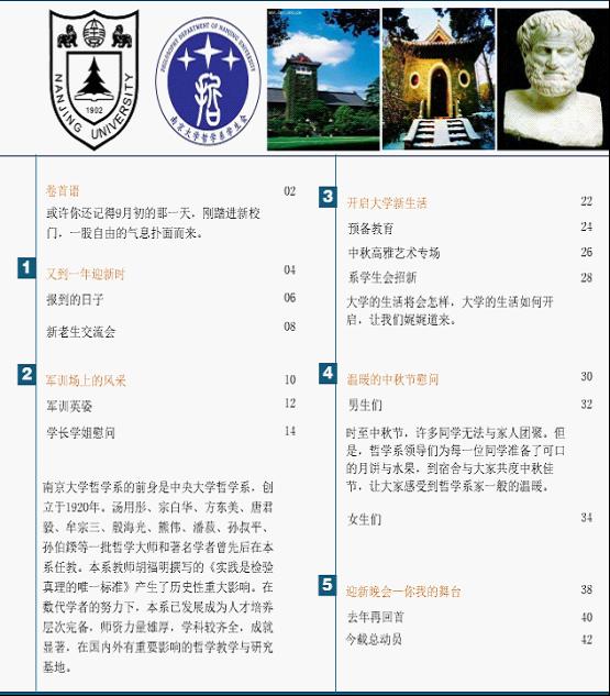金秋九月,2011级29位新一届本科生加入到南哲人的队伍中来。两个月来,经历了迎新生活动、新老生见面会、系学生会招新、军训、军训慰问、中秋节、迎新晚会筹备,怀揣希望与梦想的他们体验到了大学生活的丰富,在系领导的慰问关怀下感受到了南哲大家庭的温暖。对于踏入大学之门的新生们来说,这些经历必将成为他们愉快的回忆。在这回忆里,不仅有孩子们的收获与笑脸,更有南哲人团结友爱精神的传承。为了铭记这些回忆,也为了让更多人分享南哲新生的精彩生活,我系学生生精心制作出一期电子迎新特刊。在系领导和老师的指导与关注下,在系会成员的辛苦工作和系内同学的大力支持下,本刊终于制作成功,欢迎系内外人员尽情欣赏。