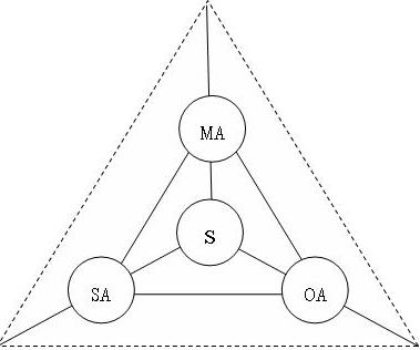 This is an embedded figure of two triangles. The central circle represents the subject of the action which can either be an individual agent or the subject of collective action. The three corners of the outer triangle are Language World, Thought World and Reality World respectively. The three corners of the inner triangle are between the subject and the three “worlds”, which are respectively Speech Action (SA), Mental Action (MA) and Objective Action (OA). The Objective Action is just what Marx called “Praxis”. Marx once used the phrase “objective activity” in “Theses on Feuerbach” as a synonym of “praxis”, the original German text is “gegenst?ndliche T?tigkeit”.